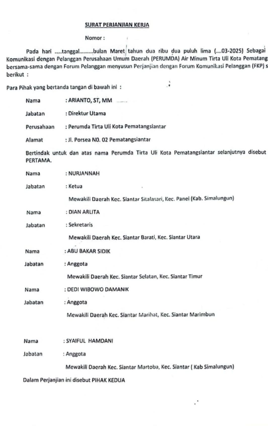 Sayangnya, Dirut Perumda Tirtauli Kota Siantar, Arianto, dikonfirmasi soal pengangkatan anggota Forum Komunikasi Pelanggan tersebut, tidak mau memberikan tanggapan. Seperti diketahui, terhitung Tahun 2025, Perumda Tirtauli Kota Siantar, mengangkat kembali 5 anggota FKP Perumda Tirtauli Kota Siantar. Nama-namanya, tercantum dalam foto di atas. Pengangkatan FKP ini sebelumnya juga sudah dilakukan pada tahun 2024 lalu. (Ung)
