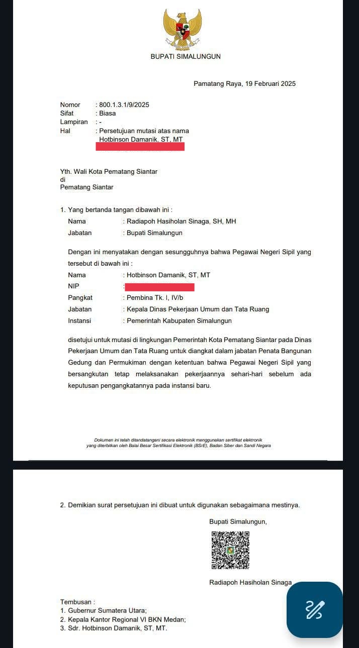 SIMALUNGUN – CSKERAS | Kadis PUTR Simalungun Hotbinson Damanik, ternyata sudah disetujui mutasi (Pindah) berkarir ke Pemko Siantar. Dibuktikan dengan terbitnya surat persetujuan di akhir masa jabatan Bupati Simalungun masa itu. Yakni, Radiapoh Hasiholan Sinaga (RHS) yang kalah bersaing melawan Anton Saragih di Pilkada Simalungun Tahun 2024 lalu.